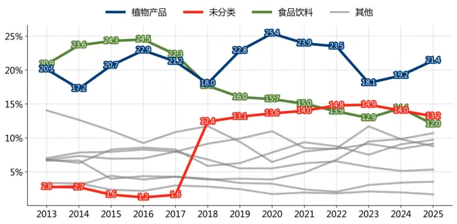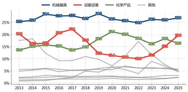 图 1_342013-2025年12月主要品类占阿根廷出口份额变化情况(按BEC5统计) 数据来源:阿根廷国家统计与普查研究所, 瀚闻资讯