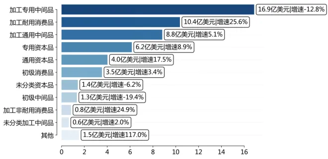 按BEC5统计,2025年1-12月,"加工专用中间品"进口规模第一,金额16.9亿美元,同比下降12.8%;"加工耐用消费品"进口增速最高,金额10.4亿美元,同比增长25.6%;总体来看,在主要品类中,有7个同比增速保持增长。