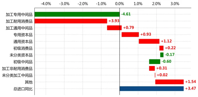 按拉动度分解,"加工专用中间品"进口拖累整体增速4.6个百分点,"加工耐用消费品"进口拉动整体增速3.9个百分点,"通用资本品"进口拉动整体增速1.1个百分点。(注:此处拉动度为本年该品类进口金额的变动与上年同期进口总值的比值。)从份额来看,"加工专用中间品"、"加工通用中间品"、"加工耐用消费品"占阿根廷总进口的比重分别为32.3%、16.2%、16.1%。