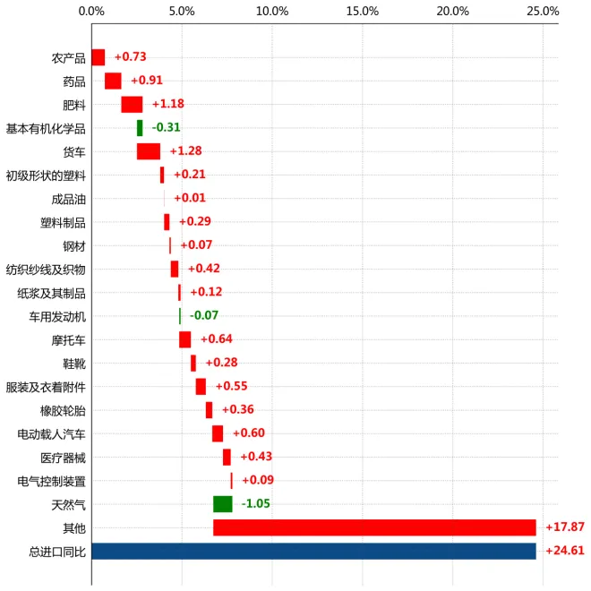 按拉动度分解,"货车"进口拉动整体增速1.3个百分点,"肥料"进口拉动整体增速1.2个百分点,"天然气"进口拖累整体增速1.0个百分点。(注:此处拉动度为本年该商品进口金额的变动与上年同期进口总值的比值。)从份额来看,农产品、药品、肥料占阿根廷总进口的比重分别为8.3%、4.0%、3.0%。