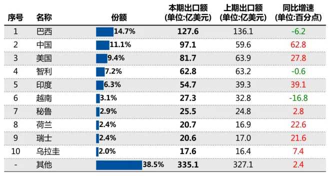 按伙伴统计,2025年1-12月,阿根廷对全球出口前三位贸易伙伴分别是巴西、中国、美国等,其中,阿根廷对巴西出口规模第一,金额127.6亿美元,同比下降6.2%;对中国出口增速最高,金额97.1亿美元,同比增长62.8%;总体来看,在前十位伙伴中,有7个同比增速保持增长。