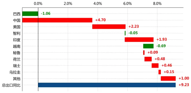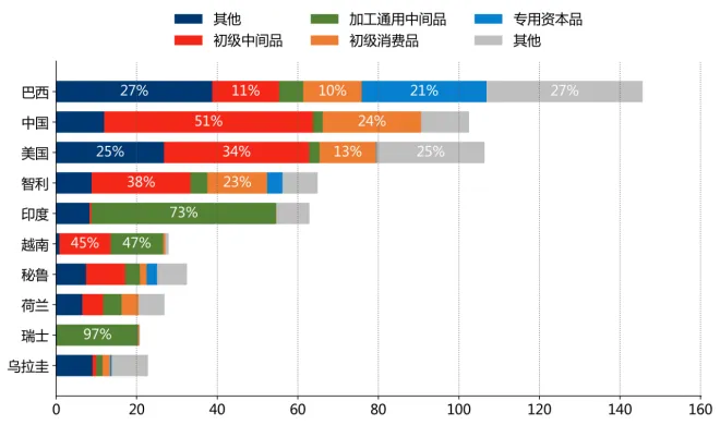 从价值链看,"其他"占对乌拉圭、美国、荷兰出口总值的比重为51.2%、32.8%、31.2%;"初级中间品"占对中国、越南、美国出口总值的比重为53.4%、46.4%、44.1%;"加工通用中间品"占对瑞士、印度、越南出口总值的比重为97.8%、84.0%、47.8%。