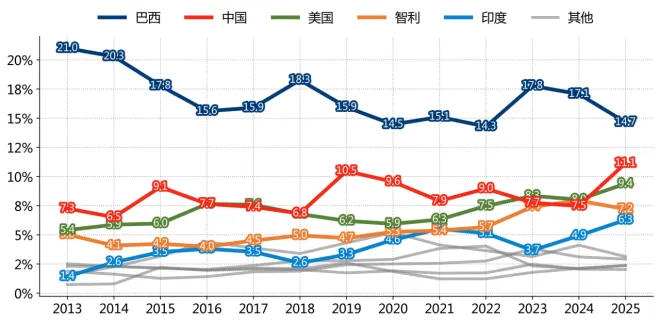 图 1_242013-2025年12月主要贸易伙伴占阿根廷出口份额变化情况 数据来源:阿根廷国家统计与普查研究所, 瀚闻资讯