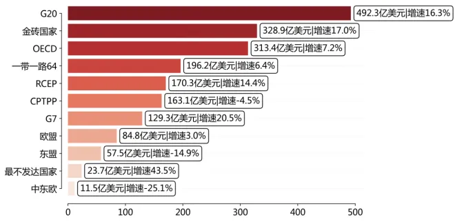 分主要经济组织/合作机制看,2025年1-12月,阿根廷出口前三名分别是G20、金砖国家、OECD等,其中,G20规模第一,金额492.3亿美元,同比增长16.3%;最不发达国家增速最高,金额23.7亿美元,同比增长43.5%。