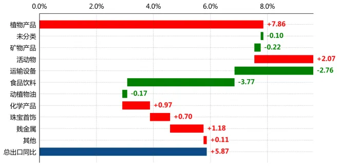 按拉动度分解,"植物产品(06-14章)"出口拉动整体增速7.9个百分点,"食品饮料(16-24章)"出口拖累整体增速3.8个百分点,"运输设备(86-89章)"出口拖累整体增速2.8个百分点。(注:此处拉动度为本年该商品大类出口金额的变动与上年同期出口总值的比值。)从份额来看,"植物产品(06-14章)"、"未分类(00/98/99/SS章)"、"食品饮料(16-24章)"占阿根廷总出口的比重分别为21.4%、13.2%、12.0%。