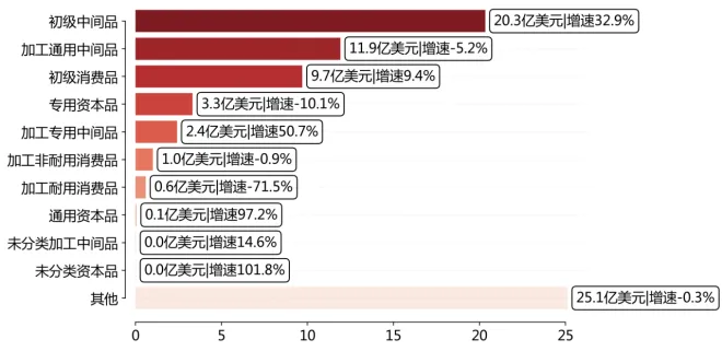 按BEC5统计,2025年1-12月,"初级中间品"出口规模第一,金额20.3亿美元,同比增长32.9%;"未分类资本品"出口增速最高,金额0.0亿美元,同比增长101.8%;总体来看,在主要品类中,有6个同比增速保持增长。