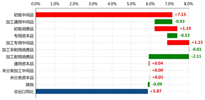 按拉动度分解,"初级中间品"出口拉动整体增速7.2个百分点,"加工耐用消费品"出口拖累整体增速2.1个百分点,"初级消费品"出口拉动整体增速1.2个百分点。(注:此处拉动度为本年该品类出口金额的变动与上年同期出口总值的比值。)从份额来看,"初级中间品"、"加工通用中间品"、"初级消费品"占阿根廷总出口的比重分别为24.7%、18.5%、13.6%。