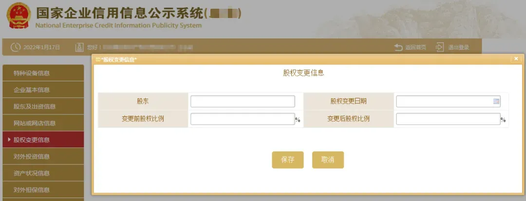 五、填写股权变更信息,点击左边的“股权变更信息”,之后再点击“保存”如未发生过股权变更的则无需填写此项信息。