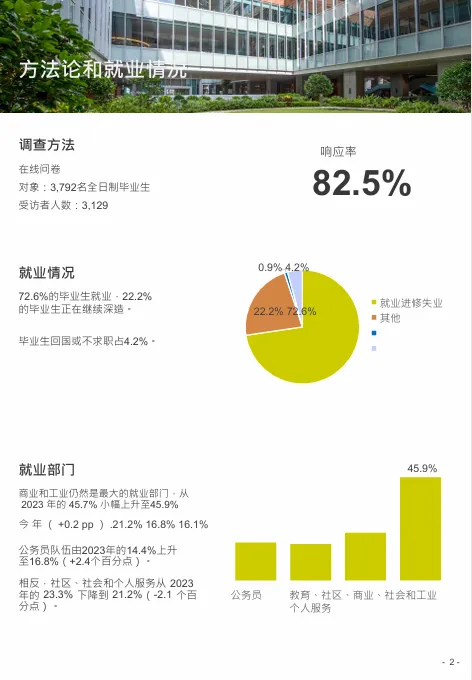 2024届香港大学3,792名全日制学士学位毕业生中,共83%参与了调查。高达98.6% 的毕业生于2024年12月底前已首次获聘。