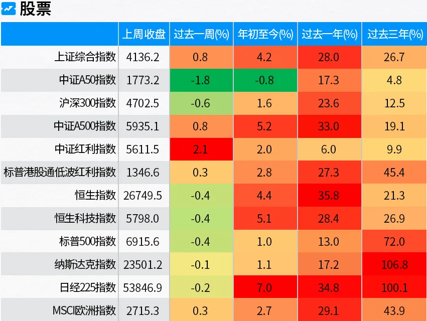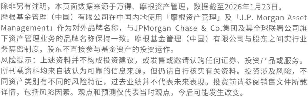 资料来源:万得,数据截至2026年1月23日。以上股票市场表现热力图中,各指数涨跌幅的颜色基于单个时间周期内该指数表现的相对强弱,产生正收益时偏向红色,相对其他指数表现越好,红色越深;产生负收益时偏向绿色,相对其他指数表现越差,绿色越深。