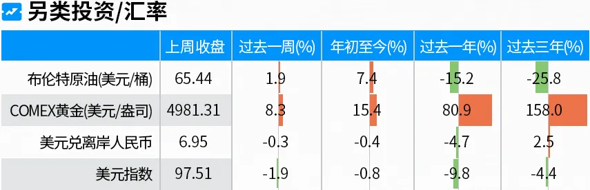 上周美欧政治博弈导致市场对新一轮贸易冲突忧虑上升,海外股债市场的大幅波动,带动黄金及白银等贵金属价格继续上行,全周伦敦金价格上涨8.3%,收在4981.31美元/盎司,逼近5000整数关口,伦敦银上周上涨14.65%,一举突破100美元/盎司的心理关口。黄金在美元走弱、地缘政治风险上升及全球央行持续购金等因素推动下,或仍具有上行的趋势,但仍需防范价格短期快速上涨的波动风险。白银价格近期的上涨,固然有一定供应不足与工业需求上升推动的重新定价,但短期涨幅导致白银价格偏离了金银比的历史均值,动能或更多来自于情绪的趋动,或需留意短期超涨后的修正风险。金银二者或均需以分批配置的策略进行中长期布局。