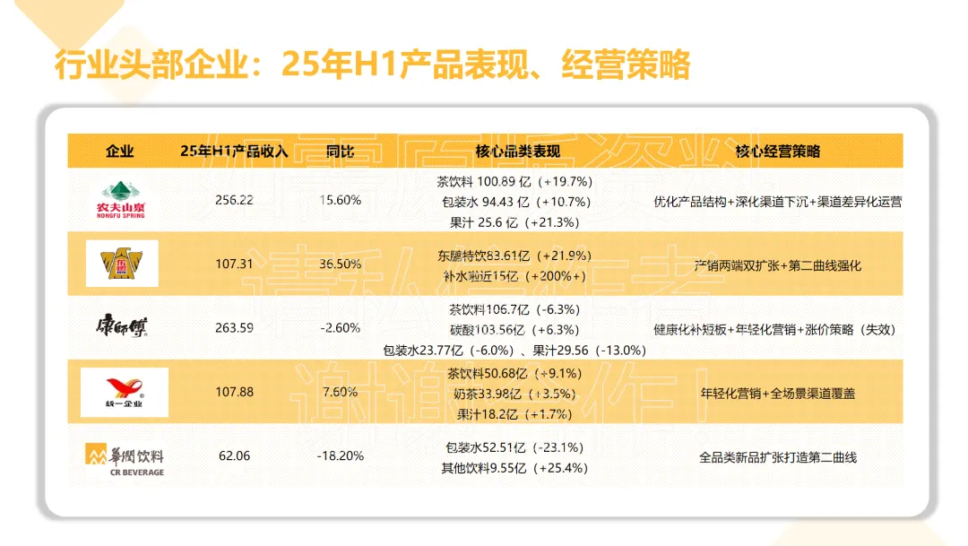 康师傅饮料的业绩下滑则暴露了战略调整的滞后性,上半年产品收入263.59亿元,同比下滑2.60%。除碳酸饮料实现6.3%的逆势增长(收入103.56亿元)外,茶饮料、包装水、果汁三大核心品类均出现下滑,降幅分别为6.3%、6.0%、13.0%。尽管企业尝试通过健康化产品补短板、年轻化营销拉新及涨价策略缓解压力,但均未达预期,传统品类的老化与新策略的落地不足,导致其市场竞争力有所弱化。