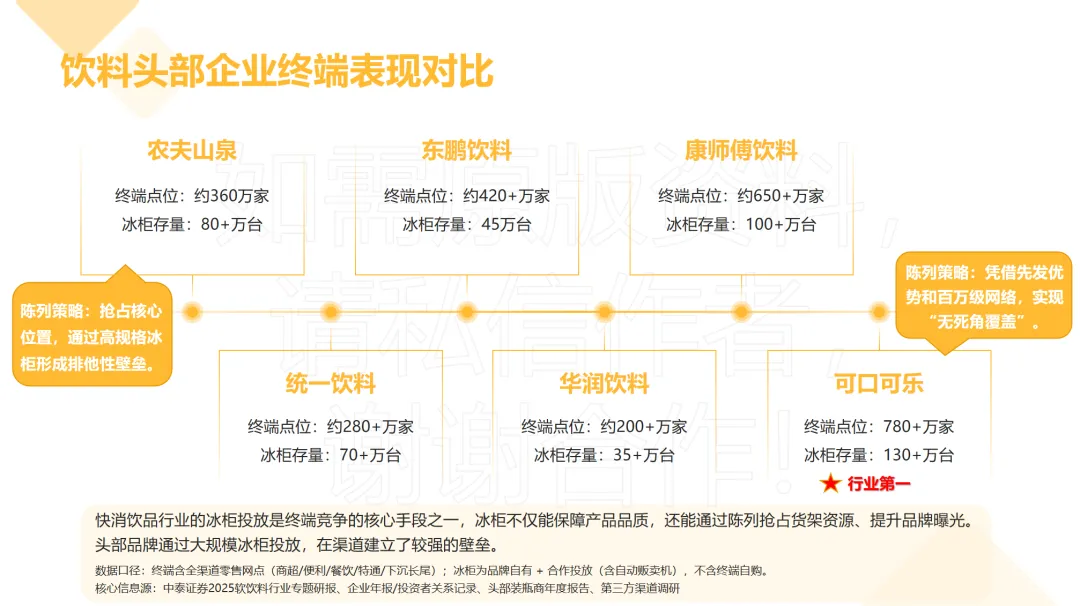 渠道终端是饮料企业竞争的“最后一公里”,而点位覆盖与冰柜投放则成为头部企业构建渠道壁垒的核心抓手。从终端布局来看,头部企业的差距显著:可口可乐以780+万家终端点位稳居第一,康师傅凭借先发优势布局650+万家点位,东鹏饮料、农夫山泉、统一、华润饮料分别以420+万家、360万家、280+万家、200+万家点位紧随其后。