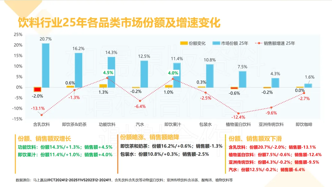 2025年,饮料各品类的市场表现呈现显著分化,传统品类增长乏力,新兴细分赛道成为行业增长的核心动力,品类格局正在经历深度调整。