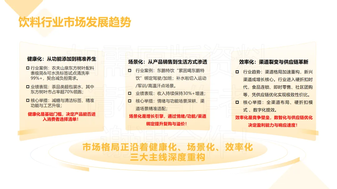 展望未来,饮料行业的竞争格局将围绕健康化、场景化、效率化三大主线深度重构,这三大趋势既是行业发展的必然方向,也是企业突破竞争壁垒的核心抓手。