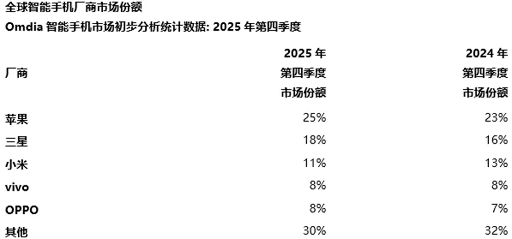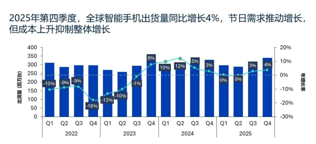 根据Omdia,2025年第四季度,全球智能手机市场同比增长4%,这一增长得益于季节性需求回升和库存管理改善,尽管部分厂商开始受到零部件成本上升的影响。