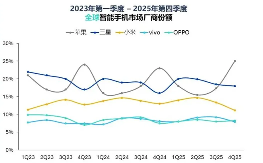 - 苹果以25%的市场份额领跑全球智能手机市场,得益于iPhone 17系列需求强劲,季度出货量创下历史新高,同时连续三年成为全球最大的智能手机厂商,小幅领先三星。
