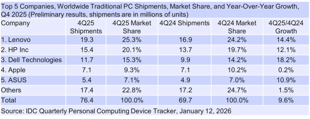 IDC:2025年Q4全球PC出货量76M,同比增长9.6%