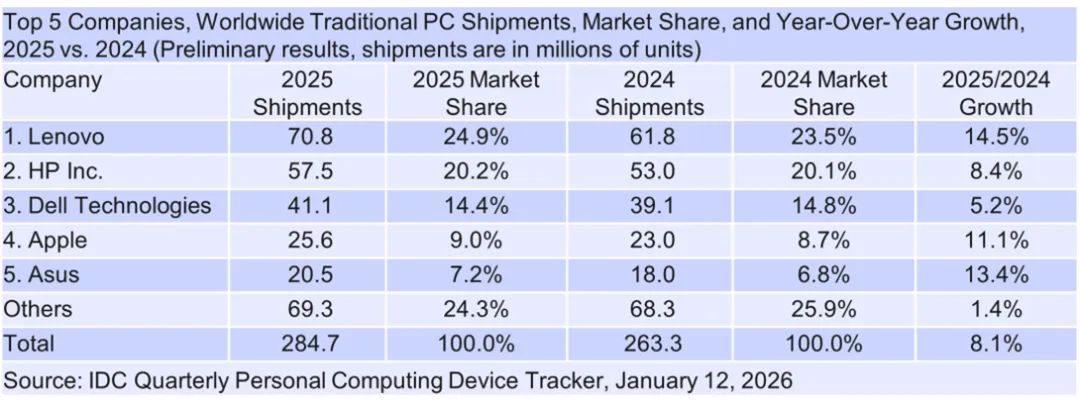 根据IDC,2025 年第四季度全球 PC 出货量同比增长 9.6%,达到 7,640 万台。回顾全年,PC 市场受到多重因素影响: