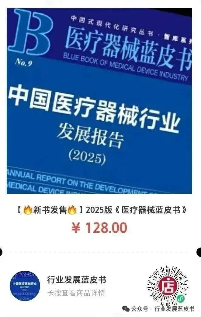 好消息:《医疗器械蓝皮书》第九部 《中国医疗器械行业发展报告(2025)》由中国药品监督研究会创研,社会科学文献出版社出版,王宝亭、王兰明、耿鸿武主编,于清明、蒋海洪、李强、卢忠副主编。该报告于2025年9月下旬上市发行,扫描上述二维码即可先行购买,出版后三日内即可发书 。出版社可为您开具发票