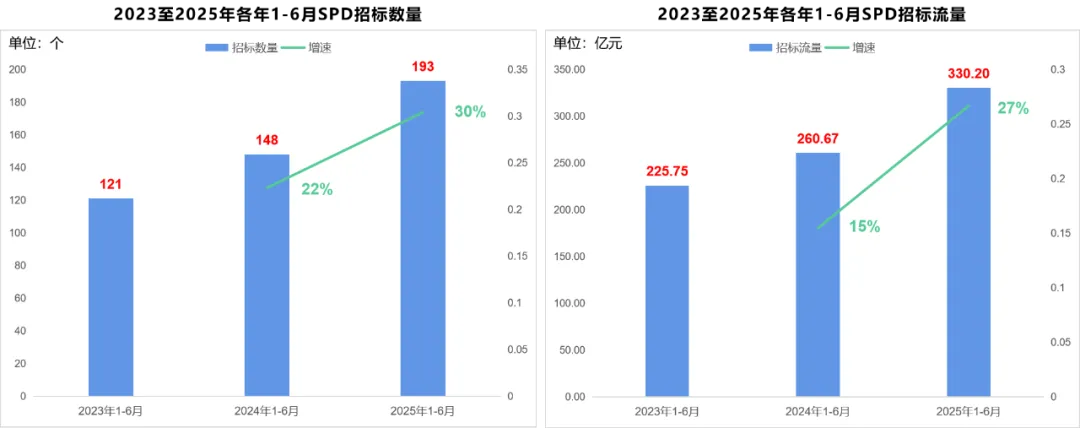 2025年上半年,SPD市场呈现数量与流量齐升的态势。据公开数据统计,招标信息数量达193条,同比增长30%,较2023年、2024年同期增幅持续扩大。招标总流量约330.2亿,同比增长27%,增速同样快于前期。