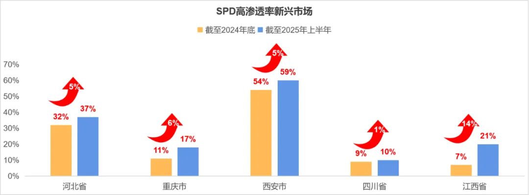 SPD行业发展初期,长三角地区及广东、山东等东部沿海经济发达、医改领先省份发展迅猛,SPD渗透率快速提升,带动全国医疗机构信息化、智能化转型浪潮。2025年上半年,上述传统高渗透区域的增长趋于平稳(渗透率增幅约3%),在前期大型项目基本建成后,新增项目以小型为主。与此同时,河北、重庆、四川、江西、西安等内陆省份及新兴区域成为强劲增长引擎,SPD渗透率增幅超过5%(除四川省外),市场需求持续释放。这表明,SPD建设重心正由成熟沿海地区向潜力巨大的内陆及新兴区域扩散,市场格局加速重塑,全国化布局对企业的重要性日益凸显。