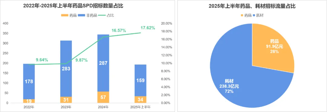 2025年1-6月,药品领域的SPD建设明显提速。据公开信息统计,药品SPD招标项目数量从2022年仅19个,以年均约10%的速度增长,至2025年上半年已达34个,占同期SPD招标总量的近18%。其项目流量占比更高,达到约28%,凸显医疗机构对药品精细化、合规化管理需求的快速增长。