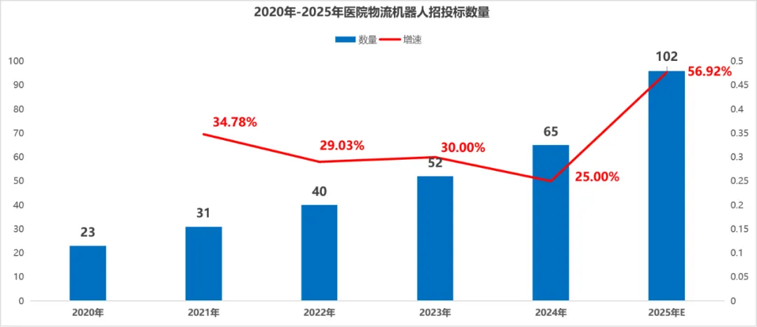 医院物流机器人市场呈现高速扩张态势,年均增速超30%。据招投标数据测算,2024年医院智慧物流机器人出货量约2000台,产值约4亿元;若包含传统气动/轨道物流系统,整体智慧物流市场规模约达15亿元,智能化升级趋势明确且加速。