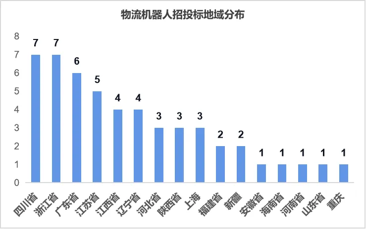 2025年上半年,物流机器人市场需求持续升温,招投标活跃度高涨。据公开信息,上半年相关招投标项目达51个(招标36个,中标15个),涉及39家医院,中标金额约6731万元。地域分布上,医院物流机器人招标覆盖全国16个省市,其中四川、浙江、广东、江苏等省份招标数量领跑,需求相对集中。