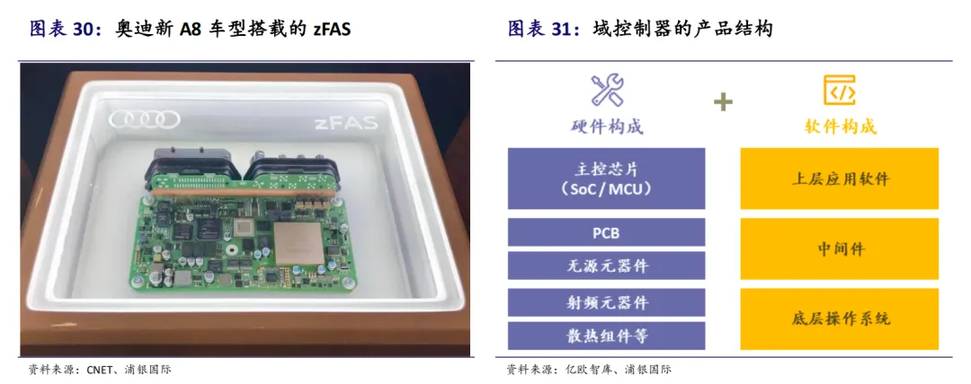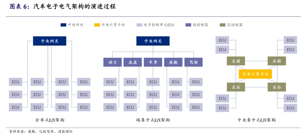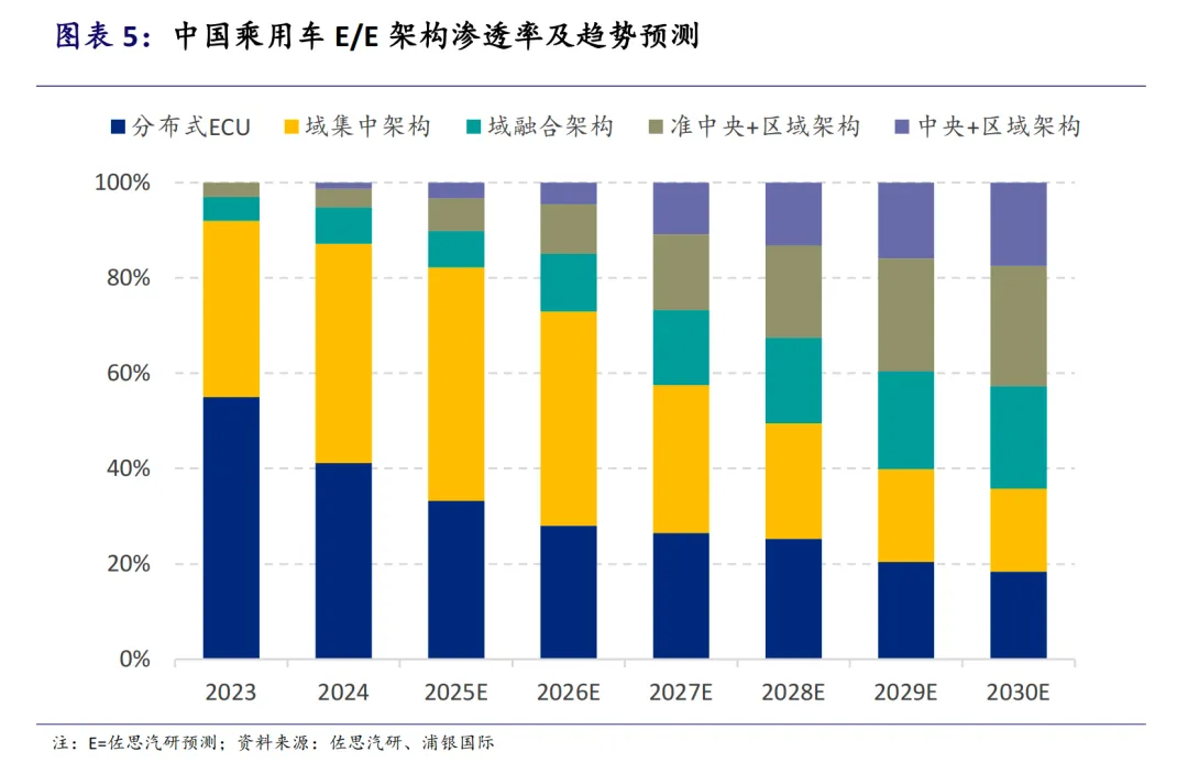 整车电子电气架构正从分布式ECU向集中式域控制器演进,并继续向中央集成式架构发展。预计到2030年,准中央/中央+区域架构的渗透率将达到42.7%。域控制器因其能够提高传输效率、简化线束、便于OTA升级等优势,逐渐成为主流选择。