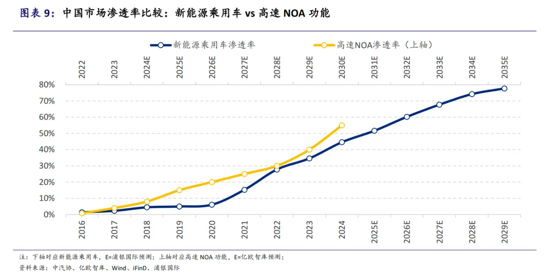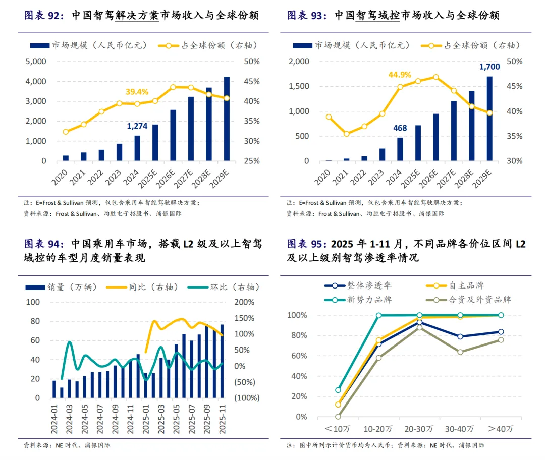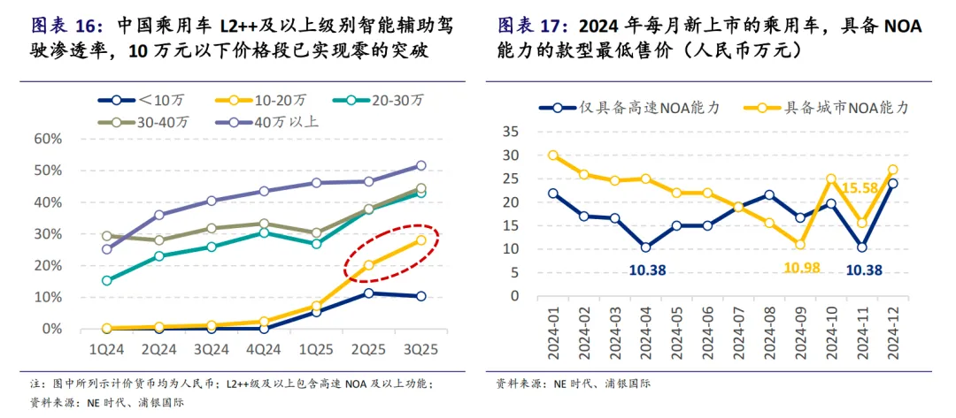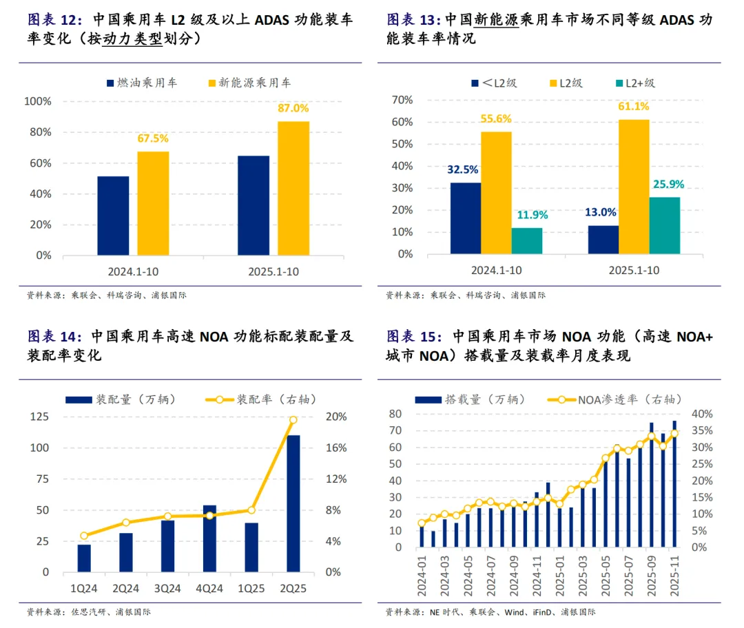 高阶ADAS功能渗透率上扬,特别是NOA功能呈现爆发式增长。2025年中国乘用车市场NOA功能渗透率预计将跃升至近20%。自主车企加速“技术普惠”,高速NOA功能价格带持续下探,带动域控制器装车率提升,尤其在10-20万元价格段车型渗透率增幅最大。