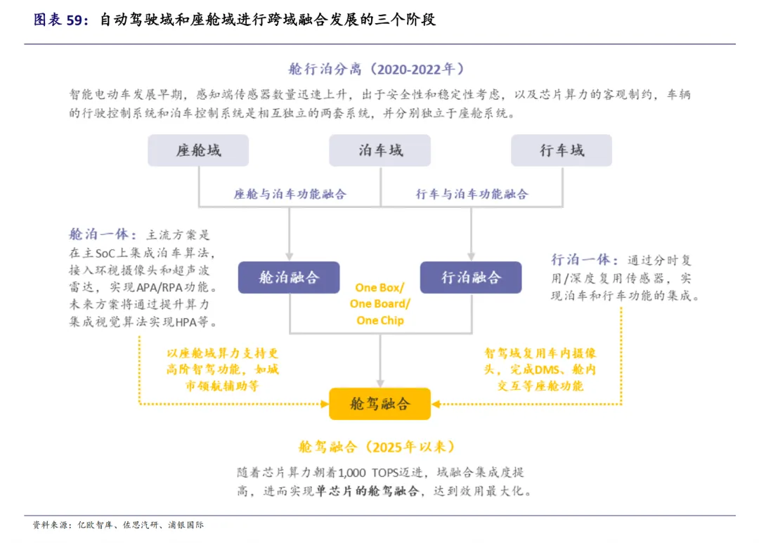 跨域融合成为发展趋势,舱驾一体是重要探索方向。行业经历了从行泊一体、舱泊一体到舱驾一体的发展过程。舱驾一体通过整合智驾域与座舱域的硬件和软件,实现资源复用与协同调度,在降低成本的同时提升交互和响应能力。预计舱驾融合域控制器出货量将快速增长。