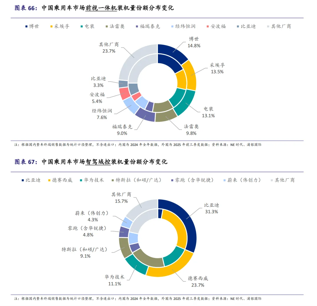 从地域看,本土厂商表现亮眼,国产厂商份额过半。中国已成为全球最大的驾驶辅助解决方案市场,2024年占全球市场的39.4%。在智驾域控制器市场,中国占据全球近半份额。国产Tier1厂商现已占据智驾域控市场过半份额,2025年前三季度,比亚迪、德赛西威和华为合计获得66.2%的份额。