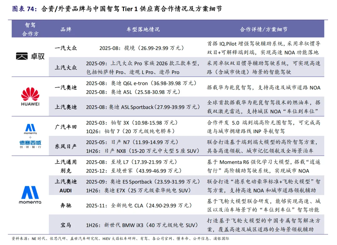 “智驾平权”驱动自主品牌快速上量,合资车企开始跟进布局。自主车企推动中阶功能向主流市场下沉,带动智驾域控车型销量显著成长。合资车企从2025年开始积极跟进“智驾普及”战略,并与本土方案商合作,释放增量市场。在合资品牌为主的燃油车阵营中,智驾渗透率还有较大提升空间。