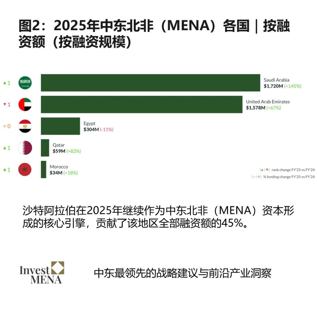 沙特阿拉伯在2025年占据了中东北非(MENA)地区风险投资(VC)投放资本总额的45%,高于2024年的32%,进一步强化了其在区域资本形成中的核心地位。就融资结构来看,沙特在两大口径下均为区域第一:MEGA(超大额)融资达5.71亿美元,非MEGA融资达11.5亿美元;其中非MEGA融资更创下该国历史新高。