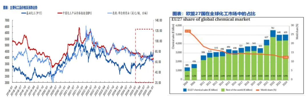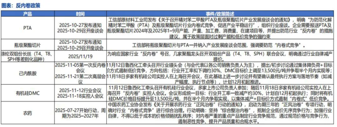 政策与行业双重优化:国内“反内卷”政策通过行业自律稳定供需、支撑产品价格底部企稳;环保监管趋严推高新增产能审批门槛,优化供给端。化工行业在PPI中权重占比25%-30%,是经济从通缩向健康通胀转型的重要抓手,政策支持提供有利发展环境。