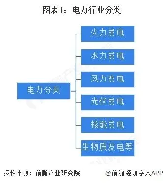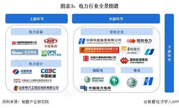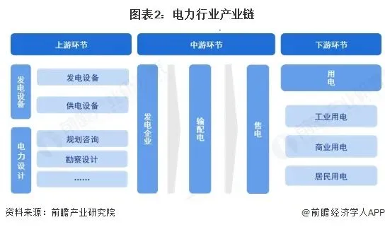 电力产业上游主要为电力系统中的发电环节,由发电设备、电力设计以及发电企业构成;中游则是输配电以及售电,由“两网”和各大售电公司等组成;下游则是用户,用于各个应用场景和行业,包括工业用电、商业用电、居民用电等。