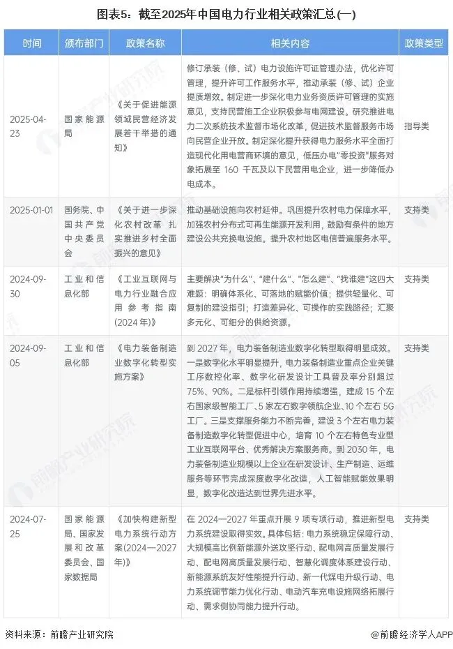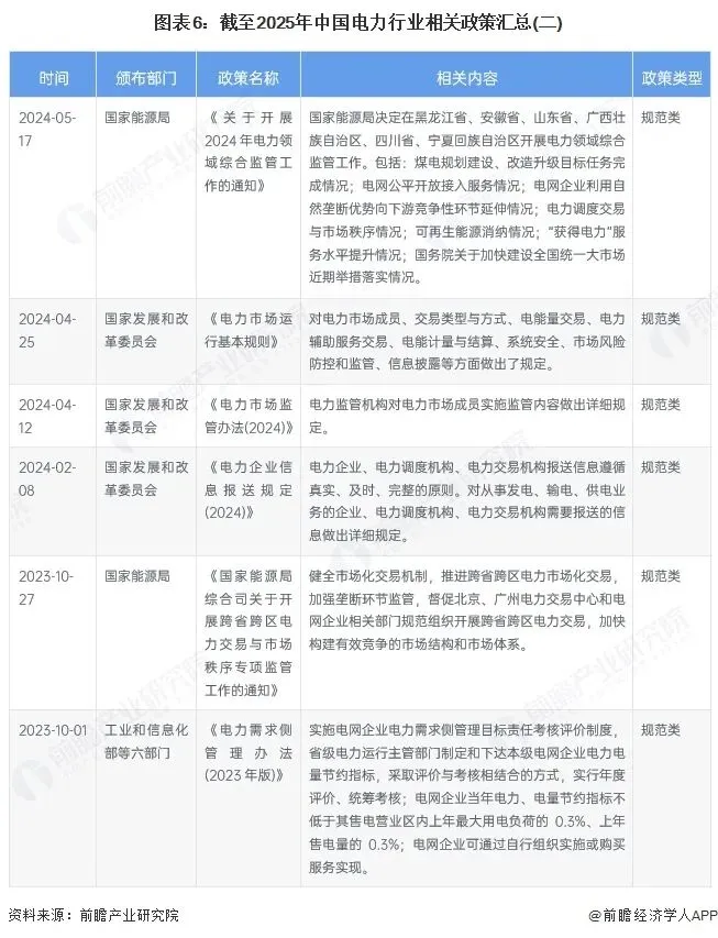 近年来,国家多部门密集出台电力相关政策,涉及电力建设、电力装备制造、电力系统调节能力、信息披露、电力现货市场、电力装备等多方面。截至2025年5月,国家层面电力行业政策汇总如下: