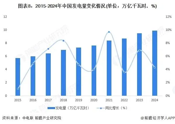 2015-2024年,全国发电量不断攀升。根据中国电力企业联合会统计数据显示,2024年,全国全口径发电量约为9.91万亿千瓦时,同比增长4.3%。