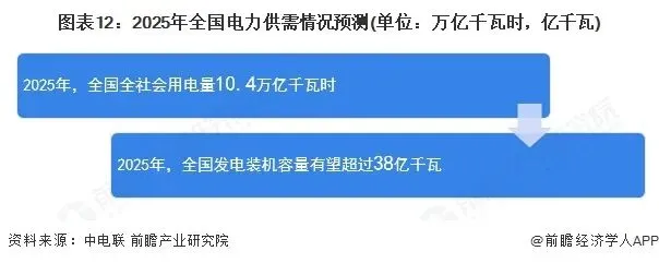 根据中电联发布的《2024-2025年度全国电力供需形势分析预测报告》,电力消费方面,预计2025年全国全社会用电量10.4万亿千瓦时,同比增长6%左右。电力供应方面,预计2025年全国新增发电装机规模有望超过4.5亿千瓦,其中新增新能源发电装机规模超过3亿千瓦。2025年底全国发电装机容量有望超过38亿千瓦,同比增长14%左右。其中,煤电所占总装机比重2025年底将降至三分之一;非化石能源发电装机23亿千瓦、占总装机比重上升至60%左右。水电4.5亿千瓦、并网风电6.4亿千瓦、并网太阳能发电11亿千瓦、核电6500万千瓦、生物质发电4800万千瓦左右。2025年太阳能发电和风电合计装机将超过火电装机规模,部分地区新能源消纳压力凸显。