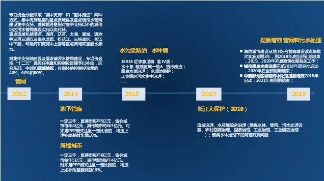 开场,井媛媛回顾了不同时期行业发展所围绕的各个政策。起初,针对厂网配套不足、污水厂“晒太阳”的问题,出台了管网以奖代补等一系列促进政策。随后,海绵城市和地下管廊的综合性问题受到重视。继而2015年“水十条”出台,2018年“长江大保护”的快速落地,而最近《城市管网及污水处理补助资金管理办法》从海绵城市建设试点、地下综合管廊建设试点、城市黑臭水体治理示范和中西部地区城镇污水处理提质增效四个维度提供补助。此外“十一五”、“十二五”、“十三五”等每个五年规划都对水务行业起到推进作用。水务行业从最初的单点到当前的综合性发展,市场对行业的综合性要求不断提高。
