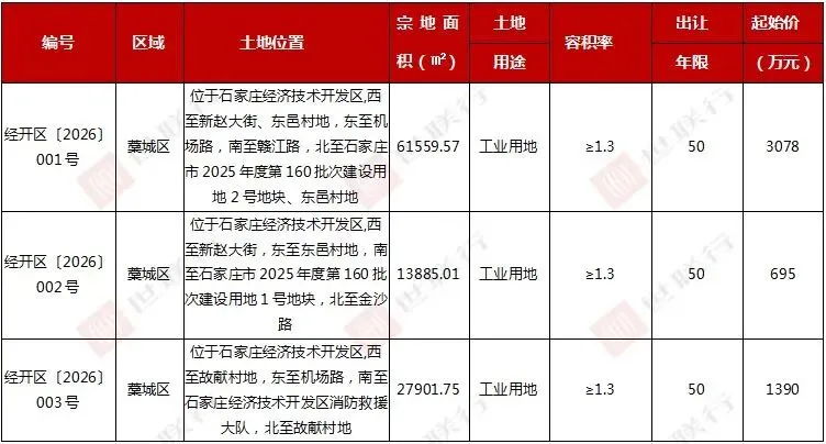 2026年第4周,共供应3宗土地,由藁城区供应,为3宗工业用地,总面积103346.33平方米,起始总价5163万元。土地详表如下: