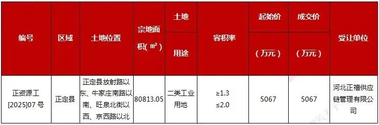 2026年第4周,共成交1宗土地,由正定县供应,为1宗工业用地,总面积80813.05平方米,成交总价5067万元。土地详表如下: