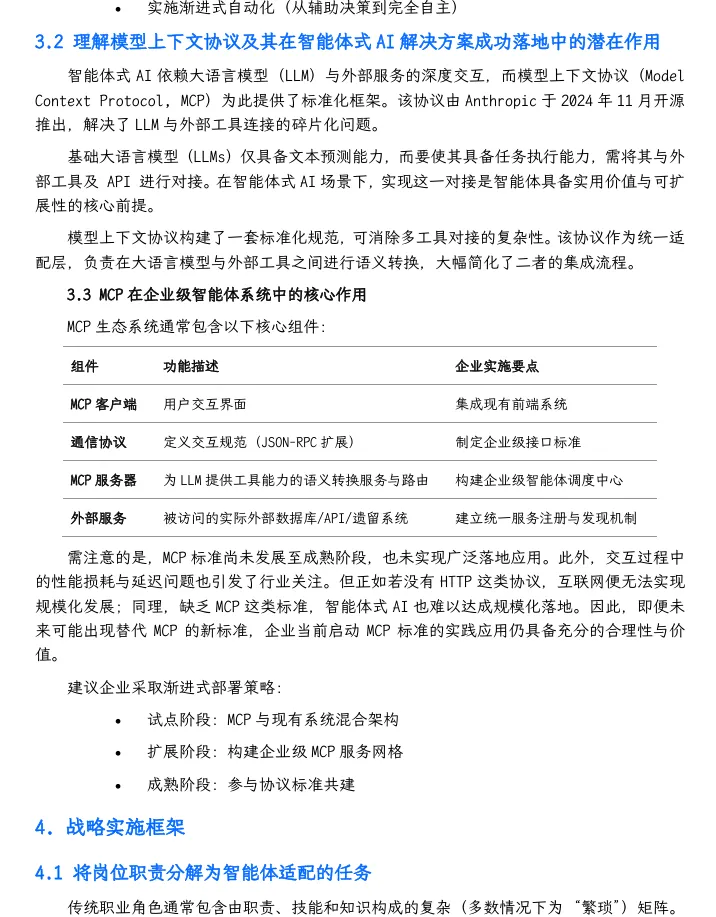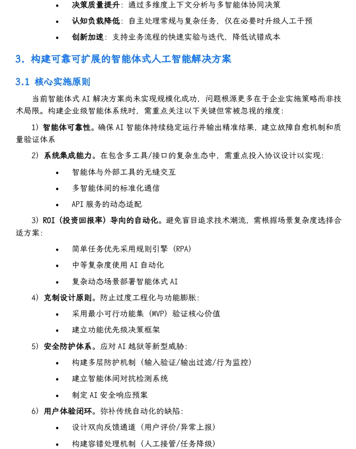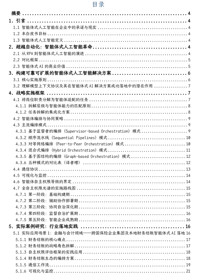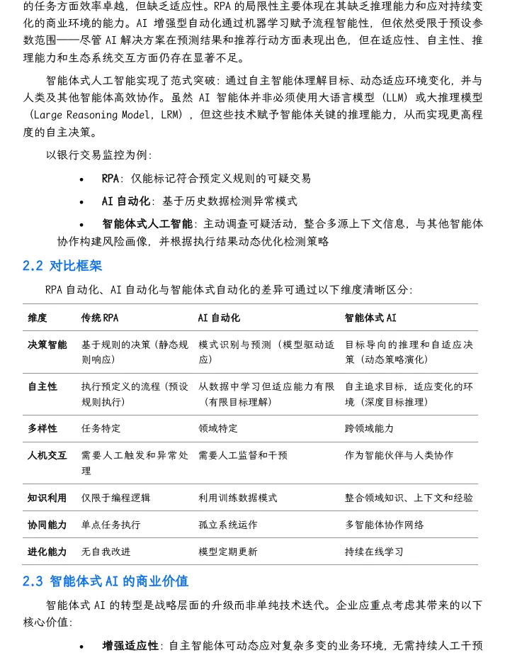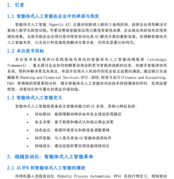 摘要:本报告基于金融、保险等领域落地实践,揭秘智能体式 AI 从“换皮自动化”到“价值创造”的核心逻辑:通过任务拆解、多智能体编排、权限精准界定,实现运营效率提升30%-70%,为企业高管、技术负责人、业务决策者提供可直接落地的战略蓝图。