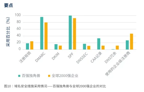 - 独角兽企业因技术基因,DMARC、DNSSEC等基础安全协议普及率领先(如96%部署DMARC),但DNS冗余部署率仅1%,90%依赖单一云基础设施,系统性风险极高。