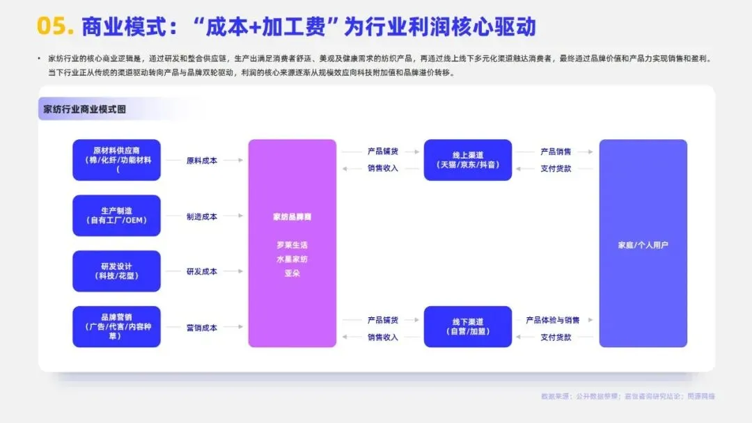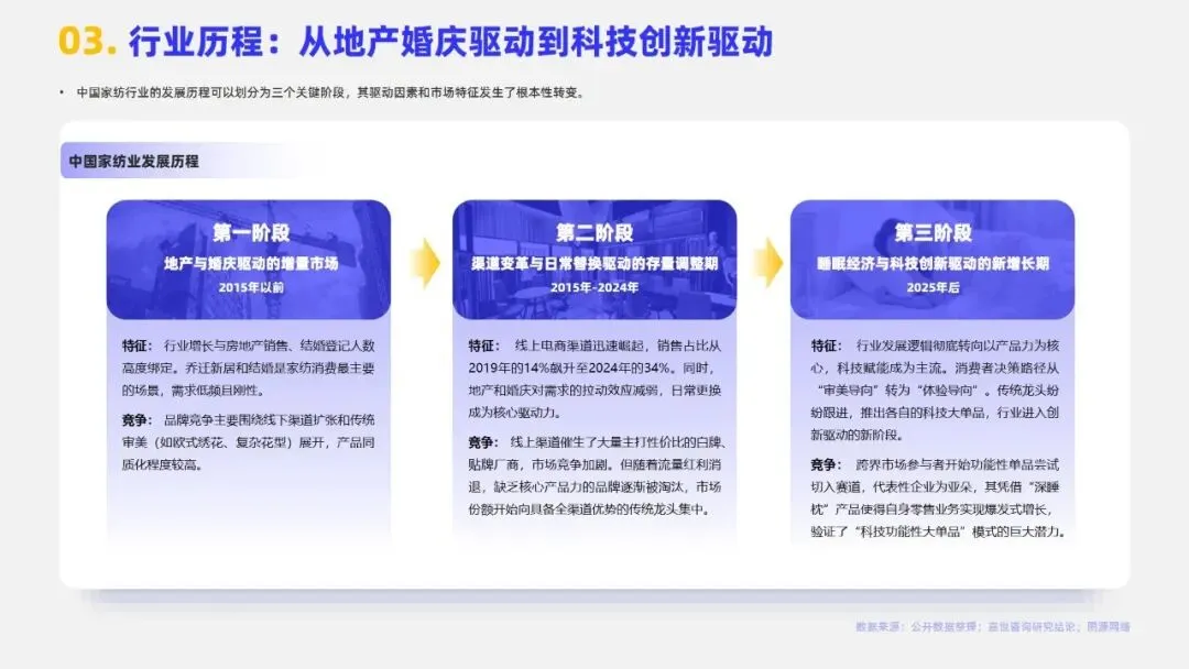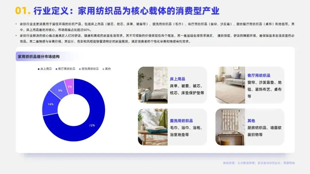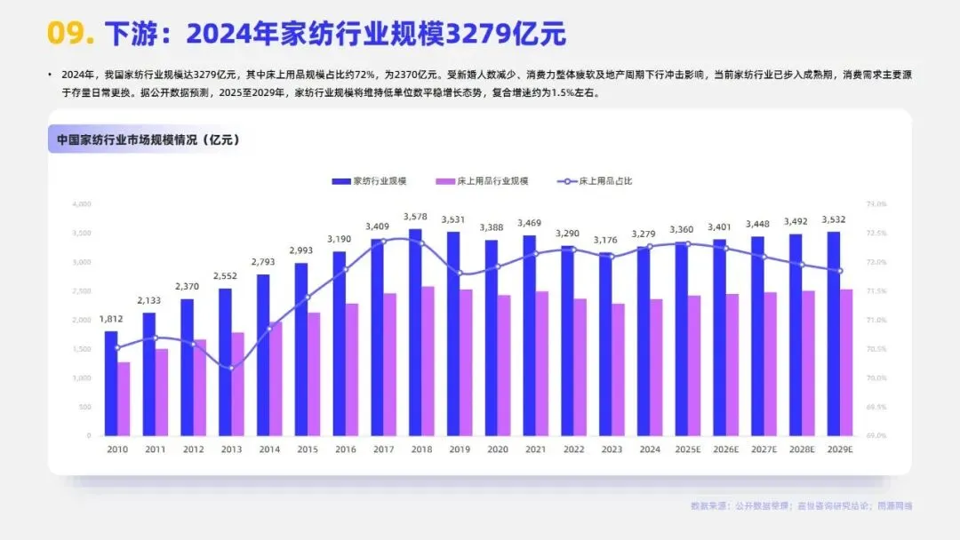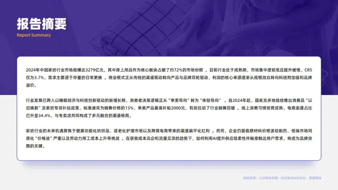 2024年中国家纺行业市场规模达3279亿元,床上用品作为核心板块占比约72%。当前行业步入成熟期,市场集中度较低,CR5仅3.7%,需求以存量日常更换为主。行业发展已迈入睡眠经济与科技创新驱动的新增长期,消费者决策从“审美导向”转向“体验导向”,商业模式由渠道驱动转为产品与品牌双轮驱动,利润核心向科技附加值与品牌溢价转移。政策端,2024年起多地推行的“以旧换新”及专项补贴政策有效拉动销售,线上渠道占比已升至34.4%,与专卖店构成多元渠道格局。未来,健康功能化产品、适老化市场及跨境电商渠道为主要机遇,但行业仍面临原材料价格波动、同质化竞争、用工成本上升及获客成本高企等挑战,AI赋能供应链与精准触达需求成为品牌突围关键。