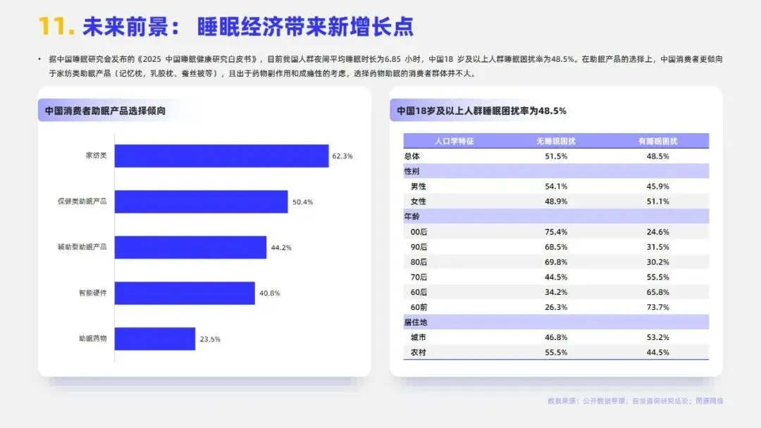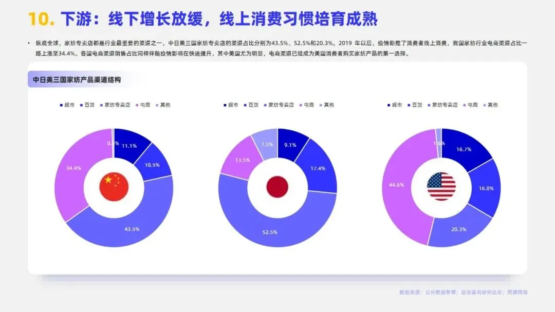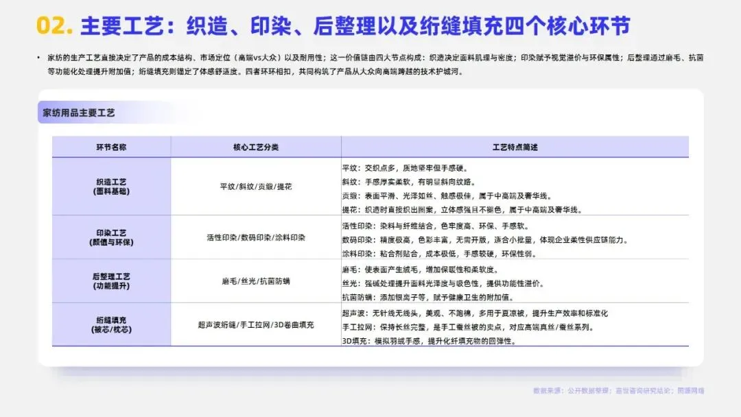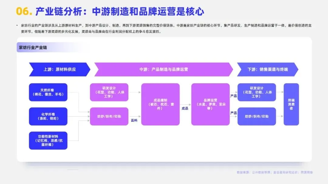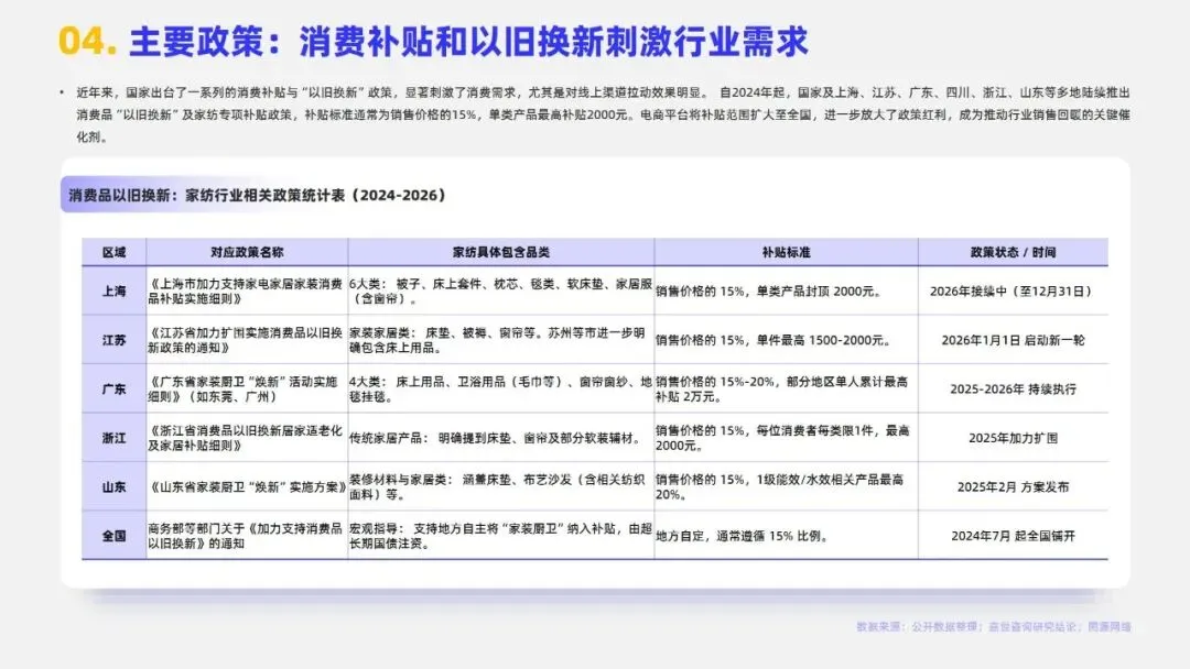 2024年中国家纺行业市场规模达3279亿元,床上用品作为核心板块占比约72%。当前行业步入成熟期,市场集中度较低,CR5仅3.7%,需求以存量日常更换为主。行业发展已迈入睡眠经济与科技创新驱动的新增长期,消费者决策从“审美导向”转向“体验导向”,商业模式由渠道驱动转为产品与品牌双轮驱动,利润核心向科技附加值与品牌溢价转移。政策端,2024年起多地推行的“以旧换新”及专项补贴政策有效拉动销售,线上渠道占比已升至34.4%,与专卖店构成多元渠道格局。未来,健康功能化产品、适老化市场及跨境电商渠道为主要机遇,但行业仍面临原材料价格波动、同质化竞争、用工成本上升及获客成本高企等挑战,AI赋能供应链与精准触达需求成为品牌突围关键。