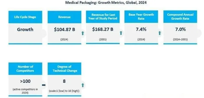 这一增长背后是医疗需求的刚性支撑。随着全球健康意识提升、医疗保障覆盖扩大,以及慢病患者群体的持续扩容,医疗包装作为药品和器械的“安全屏障”,市场需求呈现不可逆转的增长态势。数据显示,全球活跃竞争者已超100家,技术革新强度达到8级(1-10 级评分体系),行业竞争与创新活力并存。