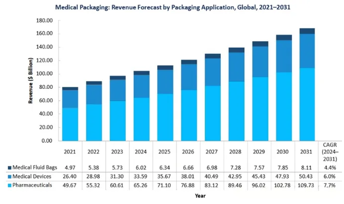 图2:2024-2031年医疗包装细分市场的规模与增速