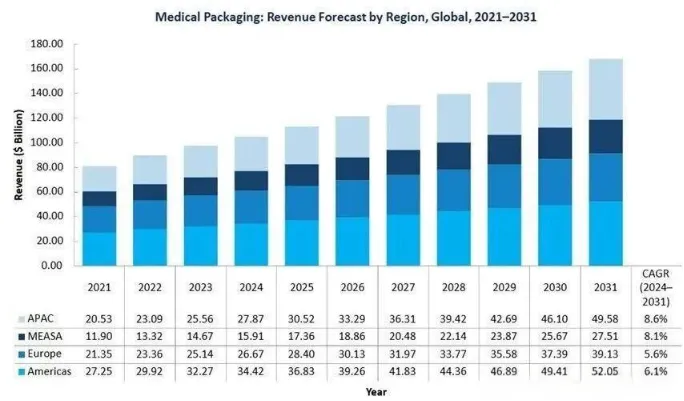·MEASA地区(中东、非洲、南亚):潜力巨大,2024年占比11.21%,2024-2031年CAGR 达8.6%,2031年市场规模将达199.6亿美元。沙特“2030愿景”推动药品制造产能升级,非洲市场虽基数小但增长迅猛,防伪包装和温控包装需求强烈。